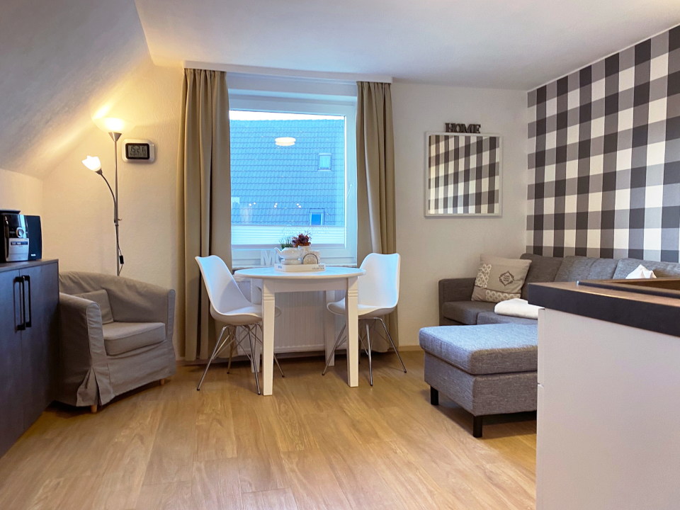Die modern eingerichtete Dachgeschoß-Ferienwohnung bietet 2 Personen eine gemütliche Unterkunft für einen erholsamen Aufenthalt auf der Insel Borkum. Die Wohnung ist 37 qm groß und aufgeteilt in Wohnzimmer mit integrierter Küchenzeile, Schlafzimmer und Duschbad.